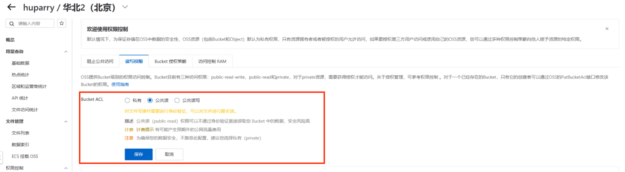 这样创建的Bucket仍是个私有网盘,生成文件链接后是无法访问的,因为阿里云默认阻止公共访问。为了能起到图床的效果,我们进入到这个Bucket的概览,找到读写权限,点击前往编辑: