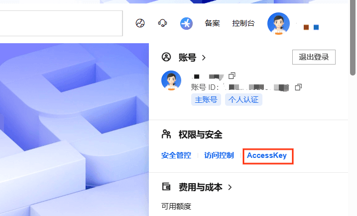 将鼠标光标移动到阿里云网站页面的右上角个人头像处,可以看到有个AccessKey的按钮,点击。