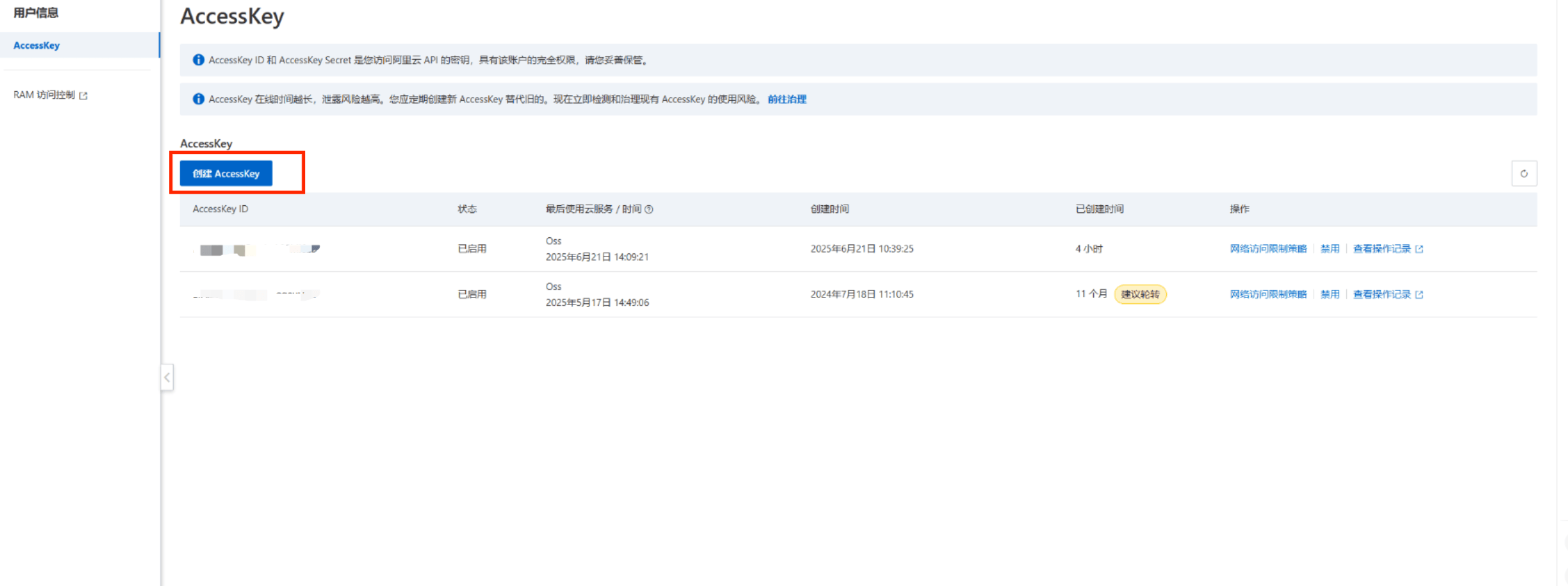 阿里云账号的 AccessKey 是访问阿里云 API 的密钥,具有该账户完全的权限。