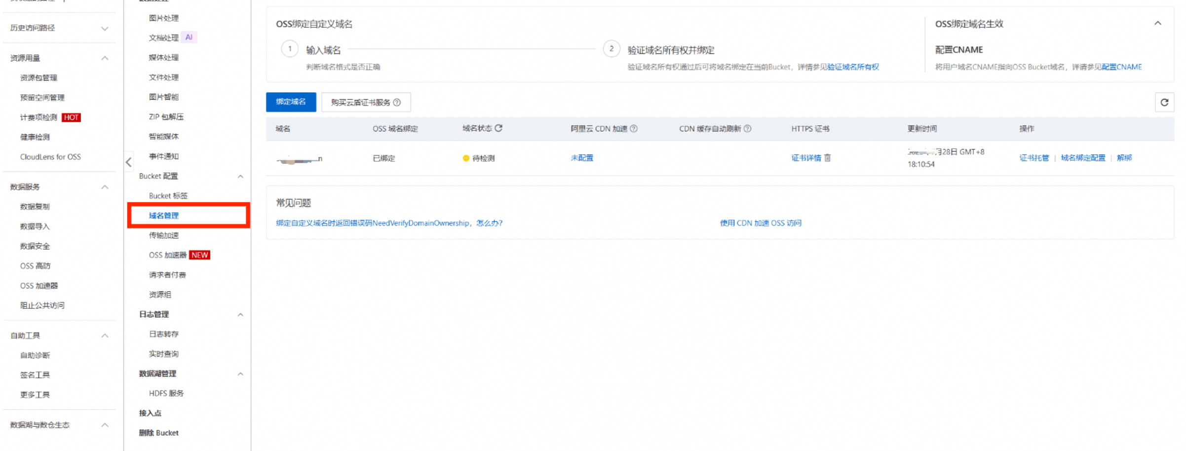 域名完成备案后,找到你的存储图片的bucket,找到”域名管理“选项: